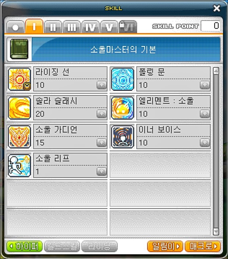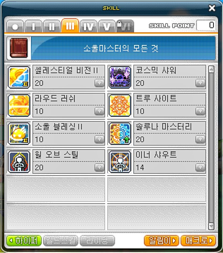셀레스티얼 비전 1 - 코스믹 메터 1 - 솔루나 타임 1 - 소울 블레싱 1 - 소드 마스터리 5 - 님블 핑거 1 - 소드 마스터리 M - 님블 핑거 M - 솔루나 타임 M - 이너 트러스트 M - 피지컬 트레이닝 M - 소울 블레싱 M - 셀레스티얼 비전 M - 코스믹 메터 M